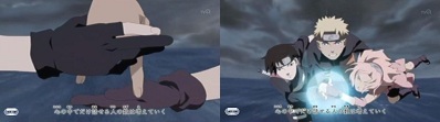 ナルトが闇ナルを抱き締める描写はもっと情緒的にやって欲しかったかも・・・。ナルサクのカットからいきなりナルトと闇ナルの抱擁だったから唐突感が強いというか。名場面だし物語的に持つ意味が大きいから、もう少し大切にして欲しかったというか。