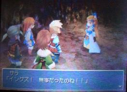 サラ姫を捜してジンのいる洞窟の中に入ったら、サラと出会いました。ジンにさらわれたとかではなく、自分の意思でジンの洞窟に来ていたというのにちょっとビビッた。姫っていうからお淑やかだと思い込んでいたらお転婆娘でした。でも城の人全員がお化けになって、イングズが無事って事も知らなかったら自分一人が何とか皆を助けなくちゃとは思うだろうから、別段彼女の行動に批判的な意見は持ちませんでした。ただイングズ達と出会った後の「私も連れて行って」には「おいおい」と思いましたが。でもそれ以上にイングズの「あとは私達に任せてお城にお戻りください」には「おいおいおい」でしたが。一人で城に帰れって危ないだろ(汗)。